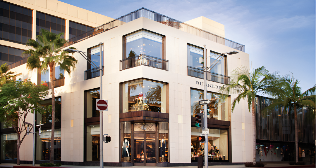 Murphy Burr Curry, Inc. provided structural design for a new three-story building for Burberry’s Flagship store in Beverly Hills. The structure features clean and classic lines with a total area of approximately 20,000 square feet and includes a partial basement, rooftop terrace, and penthouse. The building construction consists of a structural steel frame supporting  slab on metal deck floors and the lateral system consists of steel special concentric braced frames. Additionally, the interior includes a monumental decorative stair serving all floors.