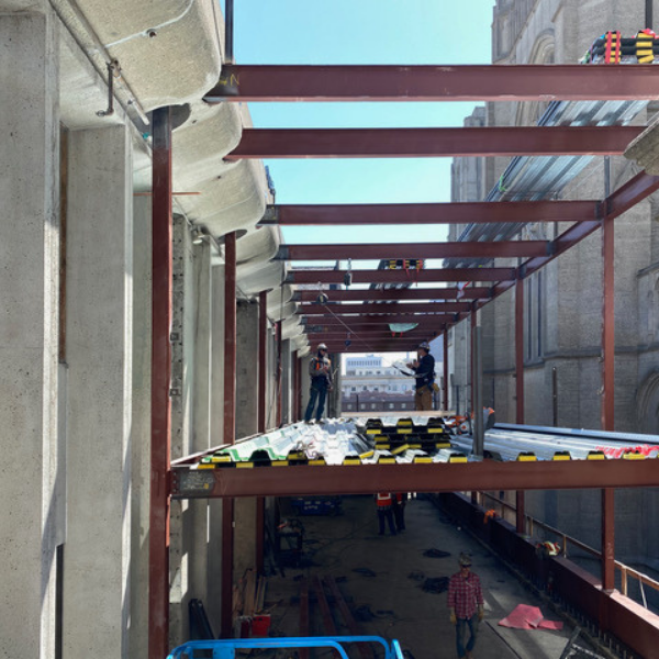 Murphy Burr Curry, Inc. provided structural engineering design services for a new two-story “learning commons” addition with a rooftop playground, above an existing concrete classroom structure, and renovation of the existing building for the Cathedral School for Boys in San Francisco. The project involved minor seismic upgrades to the structure of the existing school, local to the addition, to accommodate increased seismic demands, and to meet the requirements of the California and San Francisco Building Codes in effect at the time of construction. The foundations of the existing building were evaluated and found adequate to support the additional vertical loads, such that no new foundations for the addition were required. The scope also included revisions to column and girder locations for two new entrances, the addition of larger windows, and an infill office for a science suite in the upper school.