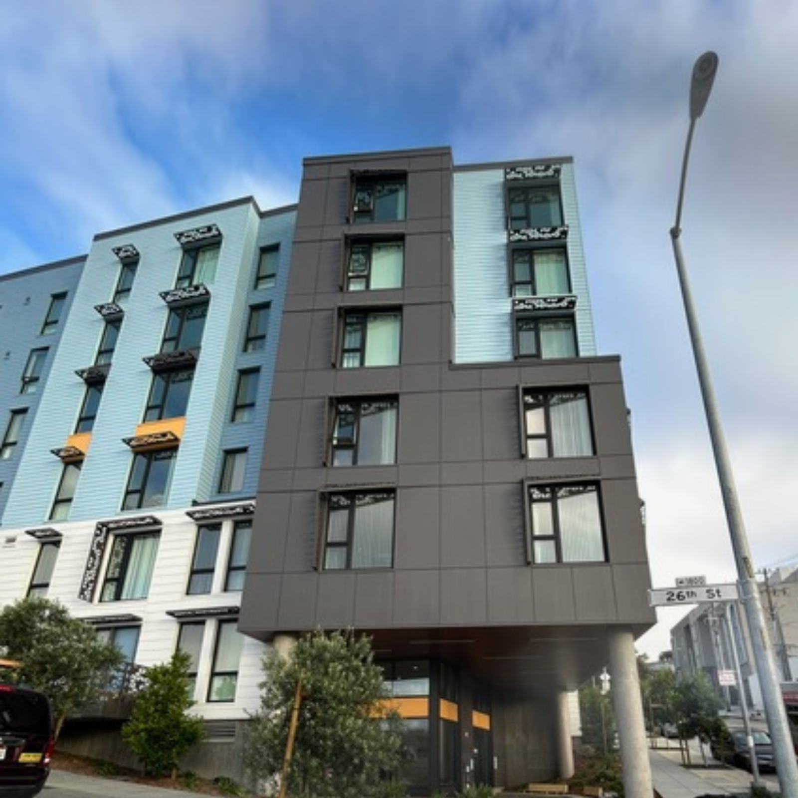 framed buildings supported by a common concrete podium. The extremely steep site presents numerous design challenges. Building footings are located below eight distinct building levels, with the concrete podium stepping up the hill. Many portions of the lateral force resisting system are discontinuous to meet the space planning needs for common areas. Most levels of the podium structure utilize a combination of suspended post-tension slab connected to the adjacent slabs-on-grade. A parking garage is located on Level 4, with automated parking stacker equipment. Above the garage, a post-tensioned slab supports a lush courtyard. Additionally, a partial permanent soil nail wall is utilized as an economic alternative to retaining walls where retaining heights are the highest. As a highly non-uniform building, MBC utilized several advanced modeling techniques to capture the seismic behavior of the building. Careful attention was paid to soil-structure interaction and the effects of non-symmetrical soil retaining forces. The end result will be a seamless building that will improve the lives of some of San Francisco’s most deserving families.