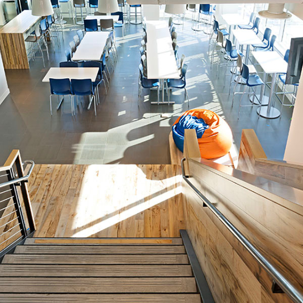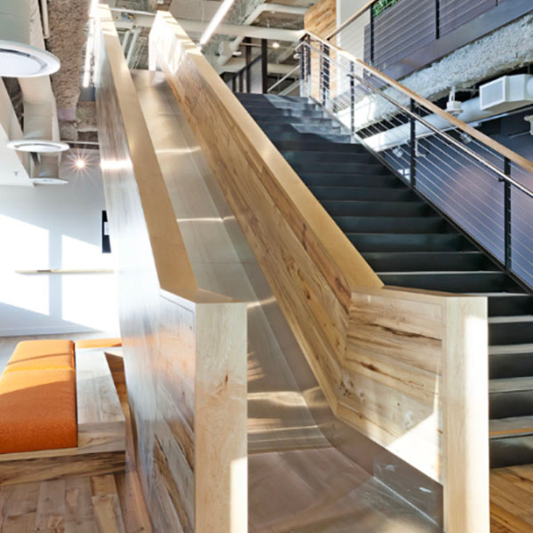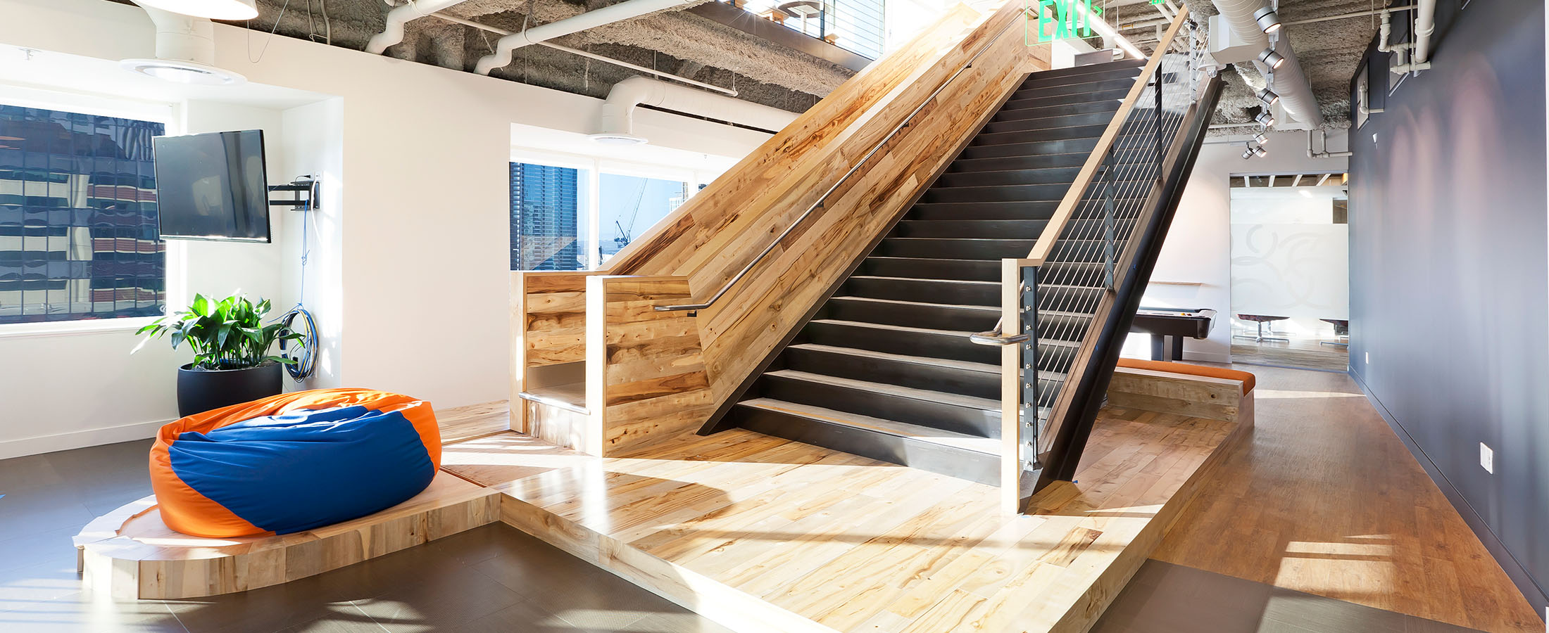 The Workday office space is on the 17th and 18th floors of an existing 20 story steel moment frame building with views of the new Transbay Terminal to the west and the Bay Bridge to the east. In order to join the 17th and 18th floor spaces the client requested a new communicating stair and, in keeping with the spirit of their work place, a slide for good measure. Murphy Burr Curry worked with the architectural team to design the structural steel for the stair, slide, and railings.